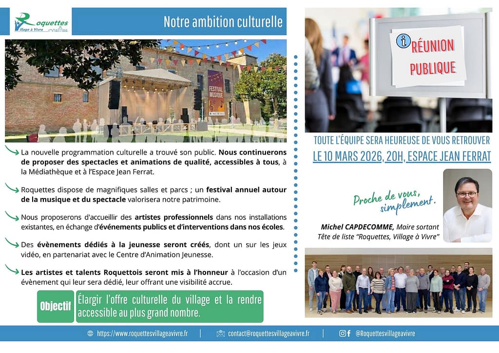 La culture à Roquettes a trouvé un nouveau souffle ces dernières années et est une réalité accessible grâce aux actions municipales et des associations du village que nous avons accompagnées financièrement et logistiquement. Continuons cette dynamique.